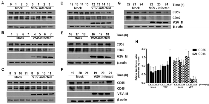 (A-G)在不同时间点对模拟和VSV感染的HeLa细胞的全细胞裂解物进行免疫印迹分析,以评估CD46和CD55的表达。使用VSV抗M抗体检测病毒感染性,肌动蛋白作为阳性对照组。CD55水平保持不变,而CD46水平从15小时后开始显著下降(在图D、E中观察到,图F、G中无条带)。整个图为三个独立实验的结果。(H) CD55和CD46蛋白表达的密度测定分析,CD55和CD46蛋白表达与对照品的比值。(doi: 10.3390/v13030373)