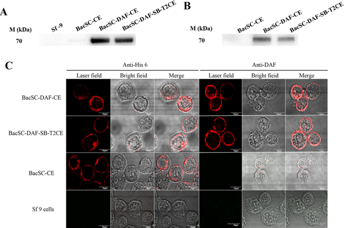 (A) BV感染昆虫细胞中DAF表达的免疫印记分析。(B) 纯化病毒粒子中DAF表达的免疫印记分析。(C) 共聚焦显微镜分析DAF蛋白定位。(doi: 10.1016/j.biopha.2019.109765)