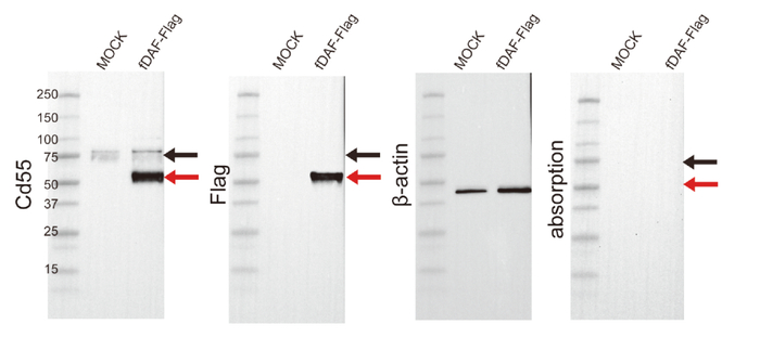 使用抗DAF、抗FLAG和抗β-肌动蛋白抗体对fDAF-FLAG-转染的HEK-293细胞进行的免疫印记分析。最右侧图为DAF抗体吸收试验结果。红色箭头:fDAF-FLAG蛋白表达情况。黑色箭头:HEK-293细胞系中的内源性人DAF表达情况。(doi:10.1371/journal.pone.0117682)