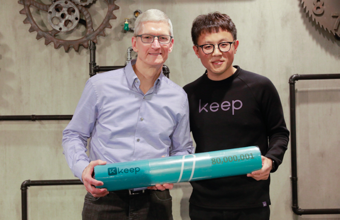 2017 年 3 月,苹果 CEO 库克访华,其中一站就是到访 Keep 位于北京的办公室。在那里,27 岁的王宁将一个印有 80000001 的 Keep 瑜伽垫赠予库克,当时正值 Keep 注册用户数突破 8000 万。这个很擅长利用媒体的年轻创业者,借力库克为自家的瑜伽垫狠狠地做了一波宣传。
