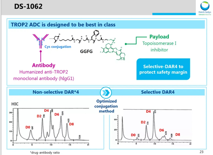Dato-DXd(DS-1062)是将Trop2单抗与DXd偶联,DAR大部分为4。