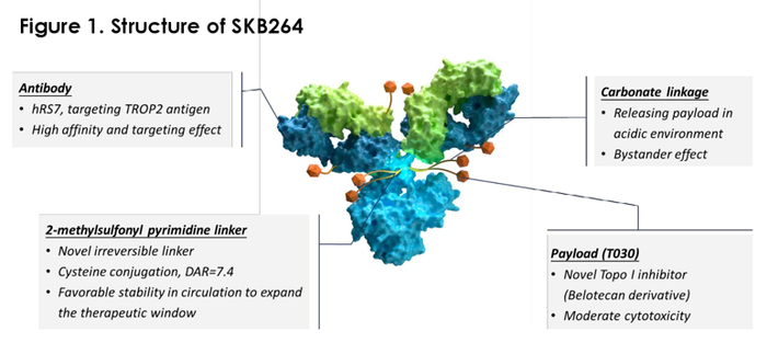 由Trop2单抗(hRS7)和SN38偶联,具有独有的稳定性连接子(VC),可降低脱靶毒性。