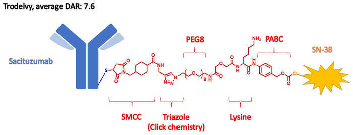 Trodelvy是国内唯一一款上市的Trop2药物,原研药厂是Immunomedics,由人源抗TROP2单抗(克隆号hRS7)、pH敏感切割Linker以及DNA拓扑异构酶抑制剂SN-38组成,DAR约为7.6。