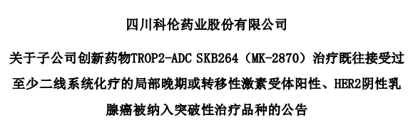 近日,科伦博泰公布,其Trop2 ADC(SKB264)治疗HR+/HER2-乳腺癌被纳入突破性疗法,这是SKB264继TNBC和NSCLC之后的第三个突破性疗法。