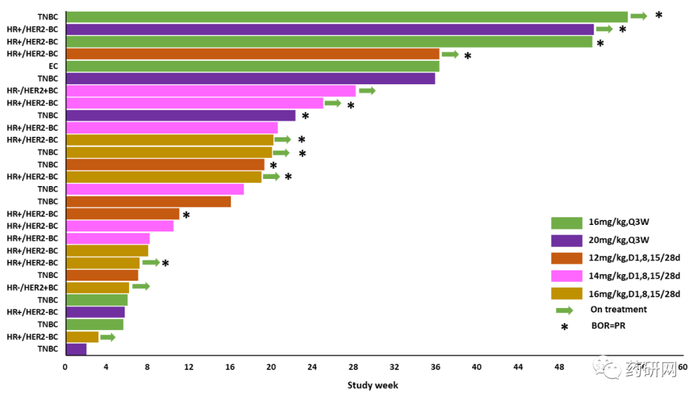 今年ASCO公布了实体瘤I期的初步数据中,入组35例:子宫内膜癌患者1例,三阴乳腺癌16例,HR+/HER2- 乳腺癌患者16例及HR-/HER2+ 乳腺癌患者2例。