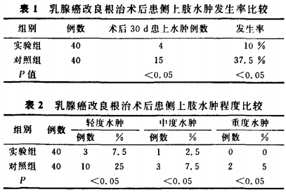 △由表1结果可见,对照组水肿发生15例,实验组患者术后应用空气波压力治疗仪辅助治疗,术后30d水肿发生4例。表2结果显示,实验组患者上肢水肿轻于对照组。