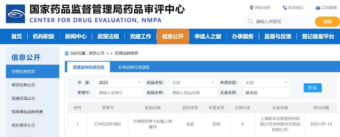 药融圈获悉:近期,苏州欧米尼医药有限公司(以下简称:欧米尼医药)向国家药品监督管理局(以下简称:国家药监局)提出沙美特罗替卡松吸入粉雾剂境内生产药品注册上市许可申请,并于近期收到国家药监局的受理通知。