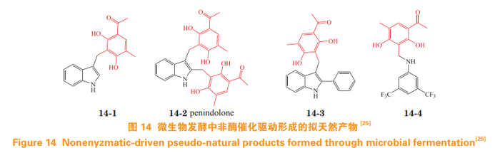 受 penilactones 启发,笔者课题组利用 clavatol 的 o-QM 过渡中间体及其非酶催化性质,在培养 P. crustosum PRB-2 过程中添加适当浓度的吲哚等含氮分子,分离鉴定了 4 个结构新颖的含 clavatol 单元的 PNPs(见图 14),酶失活等实验证实该类结构是通过非酶催化驱动形成的 [25]。拟生物碱 penindolone 表现出显著的抗禽流感病毒活性,且无明显细胞毒活性。Penindolone 不易产生耐药性。小鼠体内试验表明,喷雾或滴鼻给药都能显著提高小鼠的成活率。作用机制研究发现,penindolone 靶向血凝素(hemagglutinin),能够同时阻止病毒进入细胞以及病毒和细胞之间的膜融合过程,是一类新型的抗病毒先导化合物 [25]。