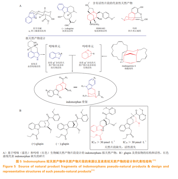 吲哚和吗吩烷生物碱是重要活性片段来源。Herbert Waldmann 课题组 [11] 设计、合成了由吲哚和吗吩烷生物碱组合的 indomorphan 类 PNPs(见图 5A),与常规合成方法获得的产物相比,indomorphans PNPs 具有更高度的三维立体特征,进一步地利用 Lipinski-Ro5 进行分析发现,61% 的 indomorphans PNPs 位于类药(drug-like)区域,提示这些 PNPs 是药物发现的理想合集。同时,生物活性测试发现这些 PNPs 是一类结构新颖的糖摄入抑制剂(活性达纳摩尔级), 且仅当吲哚和吗吩烷生物碱偶联之后才会发挥强效的抑制活性,单个片段并未表现出显著的生物活性 (见图 5B)。其中化合物 (±)-glupin 拆分后的单体活性存在显著差异,(+)-glupin 活性更佳。(+)-Glupin 可选择性靶向抑制葡萄糖转运蛋白 1(glucose transporter 1,GLUT1)和 3(GLUT3)活性,从而强效抑制肿瘤细胞的生长 [12](见图 5B)。