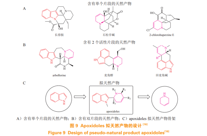 Davies 等 [16] 利用吲哚和四氢吡啶片段以单键的形式偶联,产生了一类自然界中不存在的 apoxidoles PNPs(见图 9)。生物活性评价发现 apoxidoles 是一类新的吲哚胺 2,3-双加氧酶 1(indoleamine 2,3-dioxygenase 1,IDO1)Ⅳ型抑制剂,该类抑制剂是目前的研究热点。晶体结构分析发现, apoxidoles 能选择性靶向载脂蛋白 -IDO1,阻止血红素结合,引起独特的氨基酸定位。