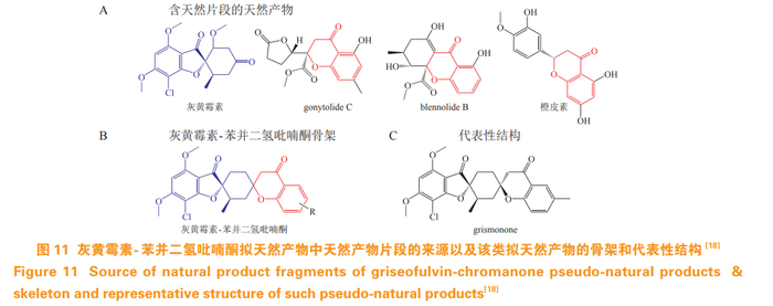 Herbert Waldmann 课题组[18] 对灰黄霉素 (griseofulvin)和苯并二氢吡喃酮(chromanone) 中的片段进行组合偶联,获得一系列拟天然聚酮化合物(见图 11)。生物活性以及化学信息学分析发现化合物 grismonone 具有最强的生物活性,其可以显著抑制 Hedgehog 信号通路,其作用靶标为 Smoothened(SMO)蛋白。Grismonone 代表了新的抑制 SMO 化学类型,构效研究发现单独的 2 个片段并不能抑制 Hedgehog 信号通路,提示片段融合产生了片段所不具备的新生物功能。