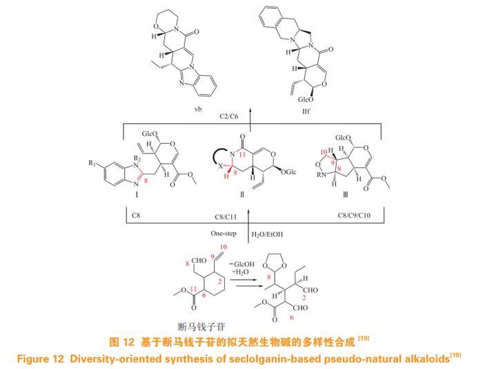 Zhu 等 [19] 基于断马钱子苷(secologanin)通过一系列温和的化学反应,包括一步对映选择转化环外的 C8 位、C8/C11 位、C8/C9/C10 位,以及化学酶法参与的环内 C2/C6 的亲核修饰,合成了一系列 PNPs。合成过程中涉及和利用了断马钱子苷中所有可能的反应位点。活性筛选发现,合成所得的化合物 vb 具有抗疟疾活性,而化合物 IIf 具有高效的神经保护功能(见图 12)。