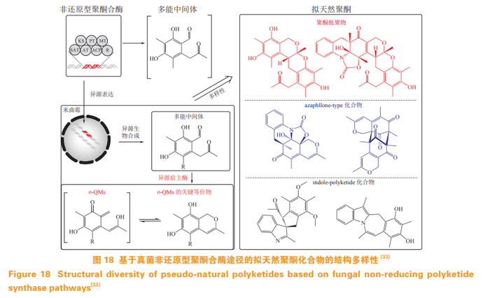 生物合成中的化学活泼中间体、不稳定产物(亦或等价替代物)已经展示了其在拓展结构空间方面的优势。尤其是具有可再生性的微生物源化学活泼物质(中间体),其在很大程度上解决了原料供给的瓶颈。化学活泼中间体具有多向性的化学反应属性,是制备 PNP 的理想起始原料。受真菌 Chaetomium sp. 产生的 chaetophenols 启发,Asai 等 [33] 推测该类结构可能存在共同聚酮来源的片段,将该聚酮片段的生物合成基因簇 pksCH-2 构建到米曲霉(Aspergillus oryzae)表达系统中,使转化株大量产生该片段,在 Aspergillus oryzae 中内源酶的作用下产生 o-QMs 活泼等价物。作者基于该活泼的聚酮片段,通过微生物发酵过程中的自身聚合以及与外源片段进行化学合成偶联,制备获得了 41 个 PNPs,包括聚酮低聚物(polyketide oligomers), azaphilone-type 分子和 indole-polyketide 杂合化合物等 20 个不同的骨架类型(见图 18)。其中 1 个化合物表现出显著的抗腺病毒活性,最大效应半数浓度(half-maximum effective concentration,EC50)为4.6 µmol· L-1 。这种联合策略驱动制备 PNP 方式为高效利用微生物中高活性的化学活泼片段(产物)提供了范例。