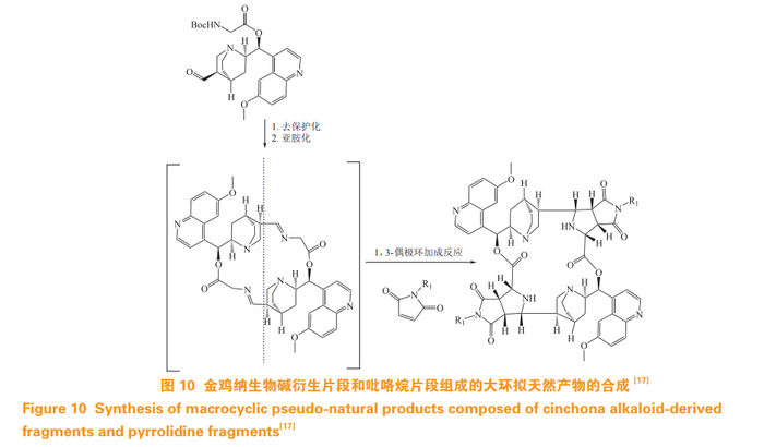 天然产物二聚化能够有效地扩展化学空间,且很多研究发现二聚化产物活性比单体活性更强,因此天然产物的聚合是化学进化的重要手段。Niggemeyer 等 [17] 利用天然产物金鸡纳生物碱,先通过反应将其奎宁环上的双键转化为醛,后通过高效、立体选择性一锅法合成对称和非对称的含有 20 元环金鸡纳生物碱片段的拟天然生物碱二聚体(见图 10)。这些合成的 20 元环二聚化产物包括 18 个手性中心和 1 个额外的天然产物片段。对产物进行进一步的官能化后,衍生获得了 163 个大环 PNPs。其中化合物 tantalosin-I 显著诱导微管相关蛋白 1 轻链 3(microtubule-associated protein 1 light chain 3, LC3)蛋白的脂化过程,该化合物用于研究 LC3 辅助的过程非常有价值。