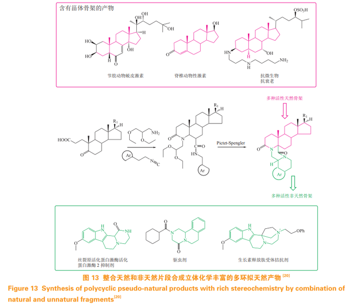 Alonso等[20]在PNP合成片段方面进行了拓展。作者依次通过分子内的乌吉(Ugi)反应和皮克特施彭格勒反应,将合成药物片段和天然甾体偶联成多环的骨架产物(见图 13),产物分布在不同的化学空间。