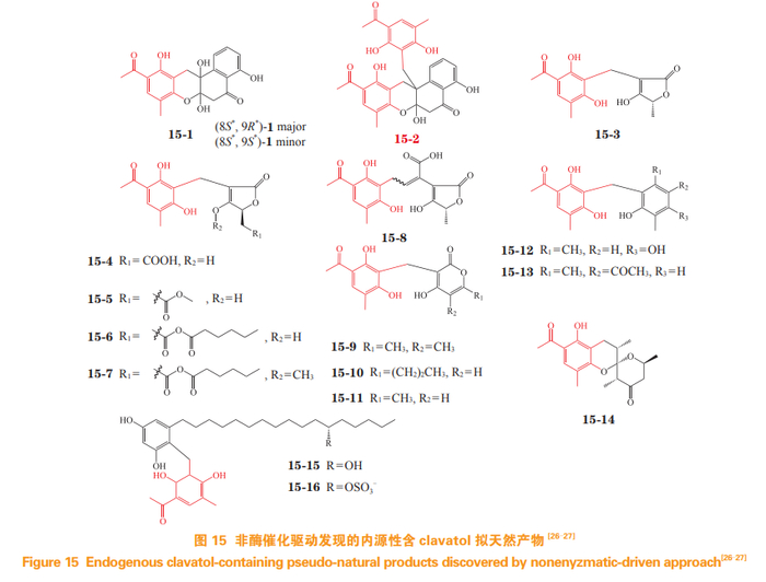 后续工作中,课题组引入非酶自组装策略,以拓展 PNP 结构丰富度。在深入调查 P. crustosum PRB-2 产 PNP 潜能时,又发现 5 种新结构类型的 14 个 PNPs(15-1 ~ 15-14),包括一类高度氧化修饰的氧杂角四环骨架(如化合物 15-1 和 15-2),该拟天然新骨架分子表现出中等强度的抗肿瘤活性 [26]。鉴于该菌产生的活泼中间体及其创造 PNP 的潜力, 笔者课题组通过将 P. crustosum PRB-2 与 Xylaria sp. 共培养,分离鉴定由 clavatol和1,3-dihydroxy-5-(12-hydroxyheptadecyl) benzene 偶联获得的 penixylarins A 和 B(15-15 和 15-16),验证发现这 2 个 PNPs 中的 clavatol 片段(见图 15 红色部分)是通过非酶 催化的迈克尔加成偶联形成 [27]。