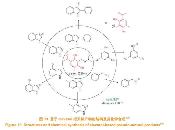 李德海课题组利用稳定的 o-QM 等价物与 6 个不同的底物一步合成了 15 个 PNPs(见图 19), 其中 4 个 PNPs 同样可以由非酶催化体获得(见图 14),其余 11 个 PNPs 则难以利用微生物发酵过程中非酶催化获得 [25]。