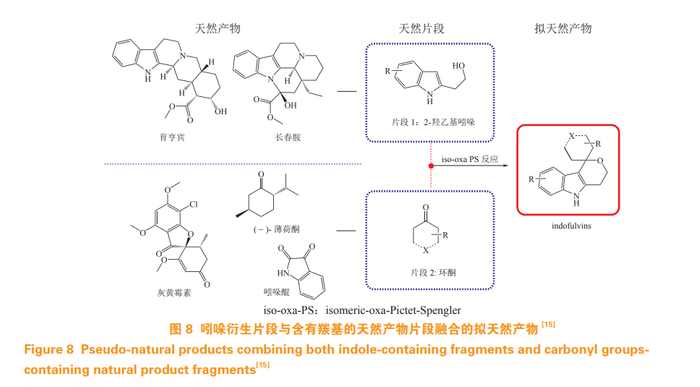 Burhop 等 [15] 提出天然产物片段可以通过非生物合成过程中的转化组合形成新颖的 PNP。皮克特 - 施彭格勒(Pictet-Spengler,PS)反应在多环生物碱合成中是重要的转化步骤。类似的 oxa-PS 反应被使用在复杂吲哚生物碱合成过程中。作者创新性地使用 isomeric-oxa-Pictet-Spengler (iso-oxa-PS) 反应,将2- 羟乙基吲哚(2-hydroxyethyl indoles)和来源于灰黄霉素(griseofulvin)等天然产物中含有羰基的片段产物组装起来,得到 indofulvins PNP 库(见图 8)。化学信息学分析表明,indofulvins 结合了已上市药物、类药和天然产物的优良特性。生物活性评价显示,indofulvins 能够调控线粒体功能而抑制自噬现象,提示 indofulvins 是一类尚未报道过的、具有新化学类型的自噬抑制剂。
