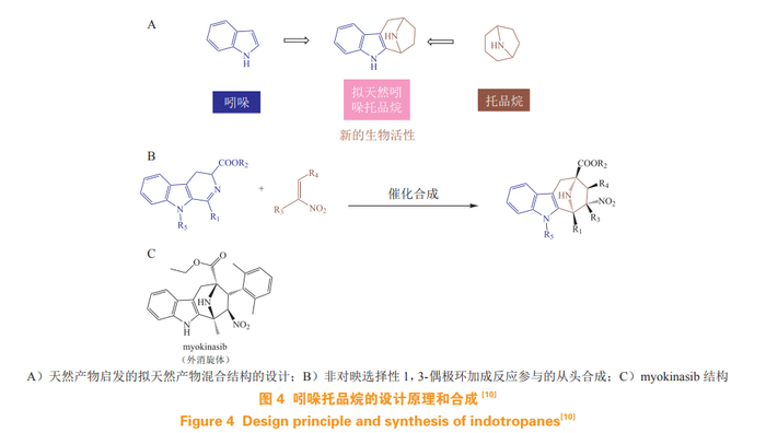 Schneidewind 等 [10] 利用吲哚和托品烷(tropane) 为起始片段从头组合,通过非对映选择性 1,3-偶极环加成反应合成了吲哚托品烷(indotropanes) PNP,其中化合物 myokinasib 为尚未报道过的新化学类型(见图 4)。它可以损害细胞质分裂、诱导多核细胞的形成以及选择性抑制肌球蛋白轻链激酶 1(myosin light chain kinase1,MLCK1)的活性, 从而降低应力纤维上磷酸化肌球蛋白Ⅱ轻链的丰度,有望成为用于研究 MLCK1 介导的细胞进程的独特分子工具 [10]。
