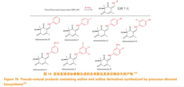 除 QM 借助非酶促产生 PNP,苯胺及其类似物与微生物次级代谢产物偶联也是产生 PNP的理想策略。Zhang 等 [30] 通过在培养基中添加苯胺类似物,从 1 株黄河沼泽来源真菌 Penicillim malacosphaerulum HPU-J01 中分离到 7 个含苯胺或苯胺类似物的 PNPs(见图 16),其中 6 个为新化合物,化合物 talaroenamine F 表现出对蜡样芽胞杆菌(Bacillus cereus)的抗菌活性,最低抑菌浓度(minimum inhibitory concentration,MIC) 为 0.85 mg · L-1 。为了进一步获得结构多样的 talaroenamines,该课题组在制备 talaroenamine F 的基础上,通过苯胺衍生物的替换,获得利用前体直接添加策略难以制备的 19 个新衍生物(见图 17), 活性评价结果表明 talaroenamine F14(17-14) 对 K562 具有细胞毒活性,半数抑制浓度(half maximal inhibitory concentration,IC50)为 2.2 μmol·L-1 [31]。实验证实这些新衍生物均为苯胺和环己二酮衍生物通过非酶催化形成,且这 2 个片段在生物合成上差别迥异,符合 PNP 设计逻辑。