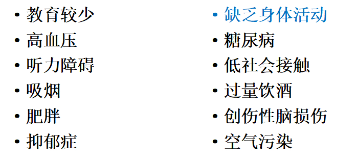 2020年柳叶刀称,12个可改变的风险因素加起来约占全球阿尔茨海默症的40%,包括:
