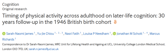 今年2月,发表在《神经病学、神经外科与精神病学杂志》(Journal of Neurology, Neurosurgery & Psychiatry)上的一项研究对1400多人进行了30年的跟踪调查,结果显示,在36-69岁之间,任何时候、进行任何程度的身体活动都有助于改善晚年的认知功能,而终身坚持身体活动效果最佳。