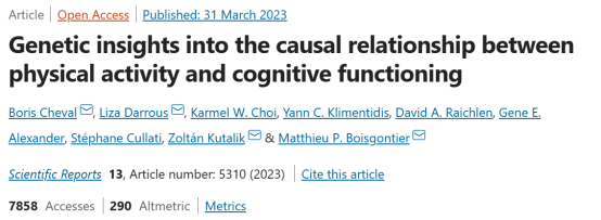 今年3月,瑞士日内瓦大学的体育科学家Boris Cheval及团队在《science》发表论文,研究者使用潜在的遗传混杂物孟德尔随机化(LHC-MR)评估英国350万人身体活动与一般认知功能之间的互相关系,研究发现,那些具有身体活动更活跃的遗传基因者,在一系列认知测试中往往表现得更好。