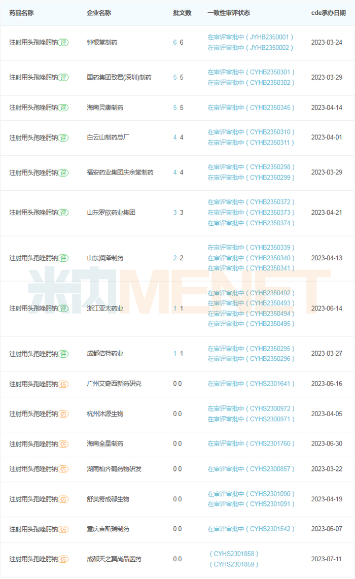 注射用头孢唑肟钠一致性评价企业申报情况