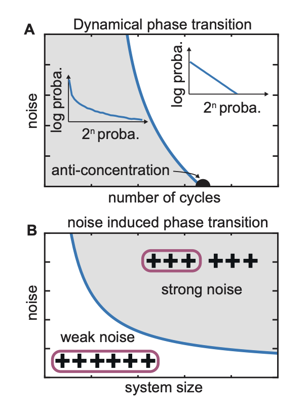 在电路深度的驱动下,系统首先经历动态相变,其中输出分布不再集中在比特串的一部分中。第二个是由噪声驱动的转换。