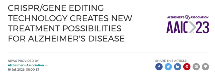 7月16日,在荷兰阿姆斯特丹举行的 2023阿尔茨海默病协会国际会议(AAIC)上,研究者报告了两种新的基于CRISPR的阿尔茨海默病治疗方法。其中一个目标是减少已知最强的阿尔茨海默病风险基因APOE-e4的影响。另一种则致力于减少大脑中有毒蛋白β淀粉样蛋白的产生,β淀粉样蛋白是阿尔茨海默病的标志,也是最近批准的治疗方法的靶点。