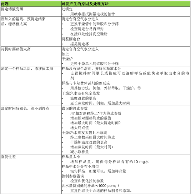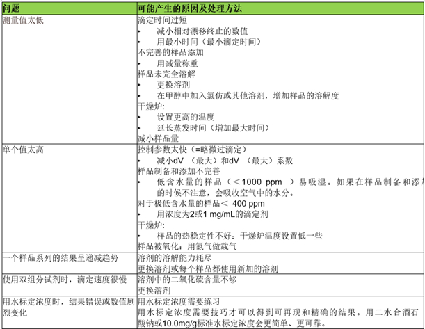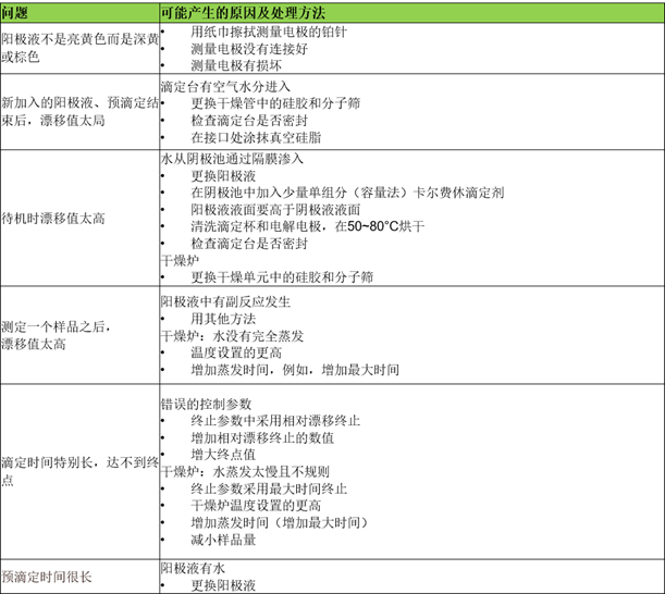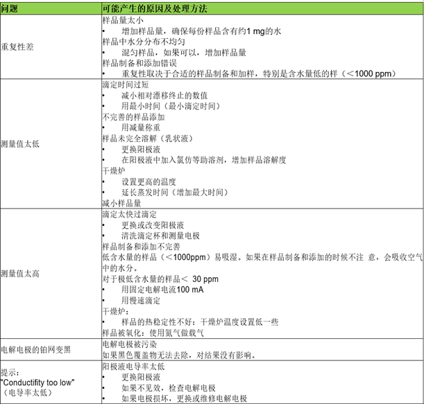 为测得全部含水量,样品必须完全溶解在阳极液中,如果样品不完全溶解,即会形成乳浊液,这样部分含水量就无法测得,因此测得的结果低于样品的实际含水量,此种情况下阳极液必须马上更换。