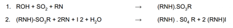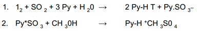 卡尔费休发现了此反应可以在含有过量二氧化硫的无水环境中测定水分含量。实验证明甲醇是合适的溶剂。为了让反应平衡向右边进行,必须中和反应过程中产生的酸(HI和H2SO4)。卡尔费休用吡啶实现这个目标。Smith,Bryanz和Mitchell[2]阐明了两步反应: