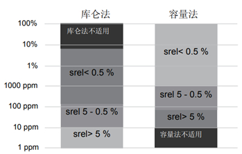 相同样品连续测量得到的结果的接近程度可用相对标准偏差(srel)来表示,以%计。在最佳样品量和优化控制的测试条件下,重复测量可以得到以下结果。图中显示了不同含水量的srel,通常样品系列的重复性会随着含水量的减小而增大。注意含水量小于10 ppm时,建议不要采用容量法滴定。