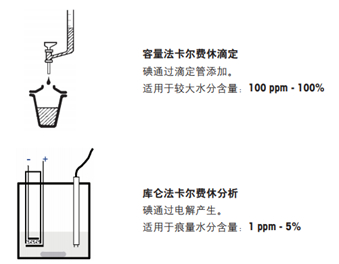 容量法:含碘的溶液通过活塞驱动的滴定管添加;库仑法:碘由杯中的电解电极产生。根据水分的预估量选择不同的测定方法。