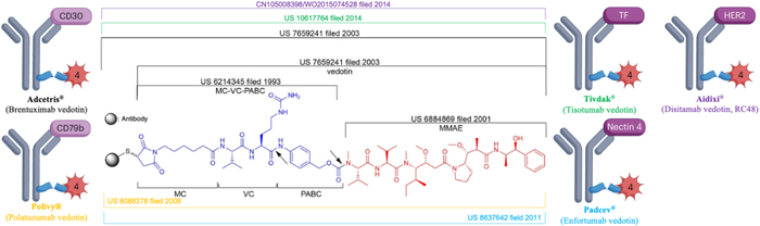 Linker部分涉及的专利可追溯至1993年,百时美施贵宝(Bristol-Myers Squibb)的研究人员开发出一种组织蛋白酶B可裂解的Linker,其中包含与自降解的对氨基苯氧羰基(PABC)间隔子连接的缬氨酸-瓜氨酸(VC)二肽(US6214345)。组织蛋白酶B是细胞中普遍存在的溶酶体蛋白酶,PABC间隔子的存在对组织蛋白酶B裂解VC二肽C端酰胺键至关重要;该专利还描述与伯胺(来自PABC)键合的马来酰亚胺-己酰基(MC)部分,三者构成新型Linker:MC–VC-PABC。2003年,Seattle Genetics提交了一项专利,涉及MC-VC-PABC与MMAE的单甲基化胺连接,该Linker-payload被称为Vedotin (US7659241);该专利中还描述了各种ADC的构建,包括Brentuximab vedotin。此后,Seattle Genetics在2007年至2010年间申请了多项ADC专利,涉及各种抗体、Linker和细胞毒性MMAE类似物(US7745394、US7829531、US7851437、US8906376)。