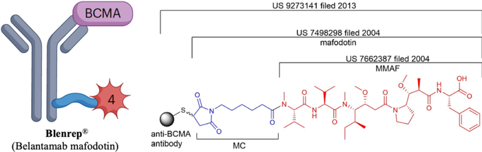2009年,GSK与Seattle Genetics签署一项许可协议,利用其Linker-payload技术,并且GSK在2013年共同提交了关于Mafodotin偶联的靶向B细胞成熟抗原(BCMA)的ADC专利(US9273141)。Belantamab mafodotin是继Trastuzumab emtansine之后第二个获批的具有不可切割Linker的ADC。随后,GSK在2015年至2020年间提交了多项关于含有各种Linker-payload的BCMA靶向的ADC专利申请(US 20160193358、US 20180147293、US 20200197529)。