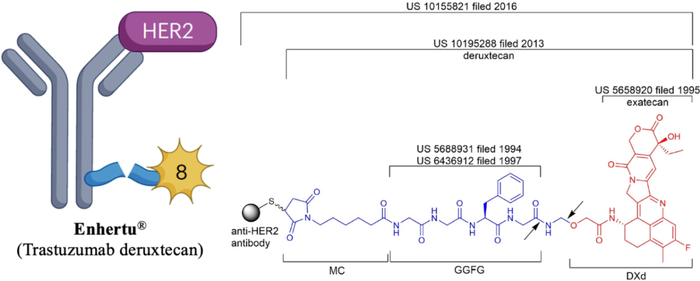 Trastuzumab deruxtecan (图7)于2020年获批,用于治疗HER2+乳腺癌和胃癌,其细胞毒素Exatecan/DX-8951f是天然细胞毒素喜树碱的合成衍生物。Exatecan由第一制药公司的科学家于1995年设计合成(US5658920)。与喜树碱一样,Exatecan与拓扑异构酶1-DNA复合物结合,防止DNA重新连接,从而导致DNA链断裂,最终导致细胞死亡。后续两份专利申请(US5770605和US5834476)中报道了各种Exatecan类似物。此外,第一制药公司还与药物输送系统研究所合作,探索蛋白酶可切割的多肽Linker,并于1997年申请了一项专利,其中涉及甘氨酸-甘氨酸-苯丙氨酸-甘氨酸(GGFG)以及许多短肽Linker (US6436912)。GGFG连接序列是由药物输送系统研究所研究人员于1994年研究多肽-阿霉素药物偶联物时报道的(US5688931)。