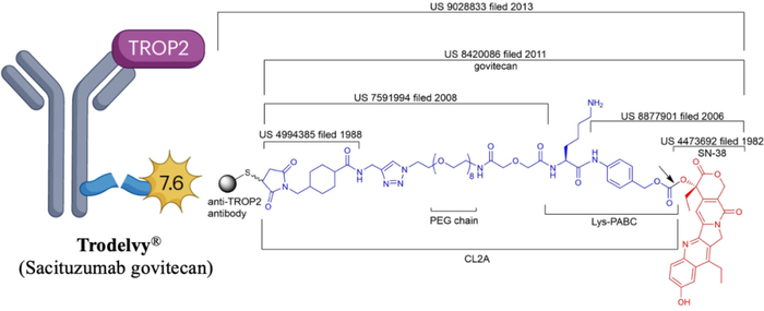 Sacituzumab govitecan(图7)于2020年获批,用于治疗三阴性乳腺癌,其Payload为7-乙基-10-羟基喜树碱(SN-38),其相关专利于1982年申请(US4473692)。与喜树碱一样,SN-38与拓扑异构酶1-DNA复合物结合,防止DNA重新连接,从而导致DNA链断裂,最终导致细胞死亡。2013年,Immunomedics提交了一项专利,涉及多种ADC,其中包括一种靶向肿瘤相关钙信号转导器2 (TROP2)的ADC,其具有与SN-38连接的新型Linker (US9028833),其中一种命名为“CL2A”的Linker后来被用于Sacituzumab govitecan。