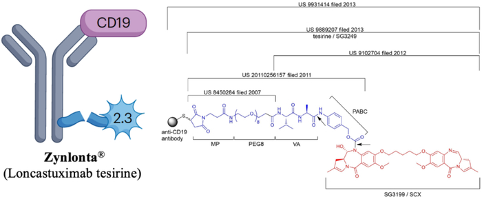 同年,阿斯利康子公司MedImmune收购了Spirogen,并与ADC Therapeutics合作,共同提交了一项专利,涉及一种带有与Tesirine偶联的抗CD19抗体的ADC (US9931414),后续获批上市。随后,MedImmune于2014年提交了描述二聚PBD类似物新偶联位点的专利(US10188746),并于2018年提交了具有新PBD类似物的新型抗CD19 ADC的专利(US10780181)。
