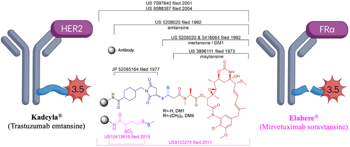 Mirvetuximab soravtansine (图5,Pink)于2022年11月14日获得FDA的加速审批,用于治疗叶酸受体α (FRα)阳性、铂类耐药的上皮性卵巢癌、输卵管癌或原发性腹膜癌(PPC)。IMGN853的Linker-Payload为sulfo-SPDB-DM4 (Soravtansine)[33],其中sulfo-SPDB由ImmunoGen在专利US10413615中公布;DM4与DM1结构类似,在前述专利中公布其结构。ImmunoGen于2011提交关于Soravtansine与抗FRα抗体偶联的专利(US9133275/CN103037900)。
