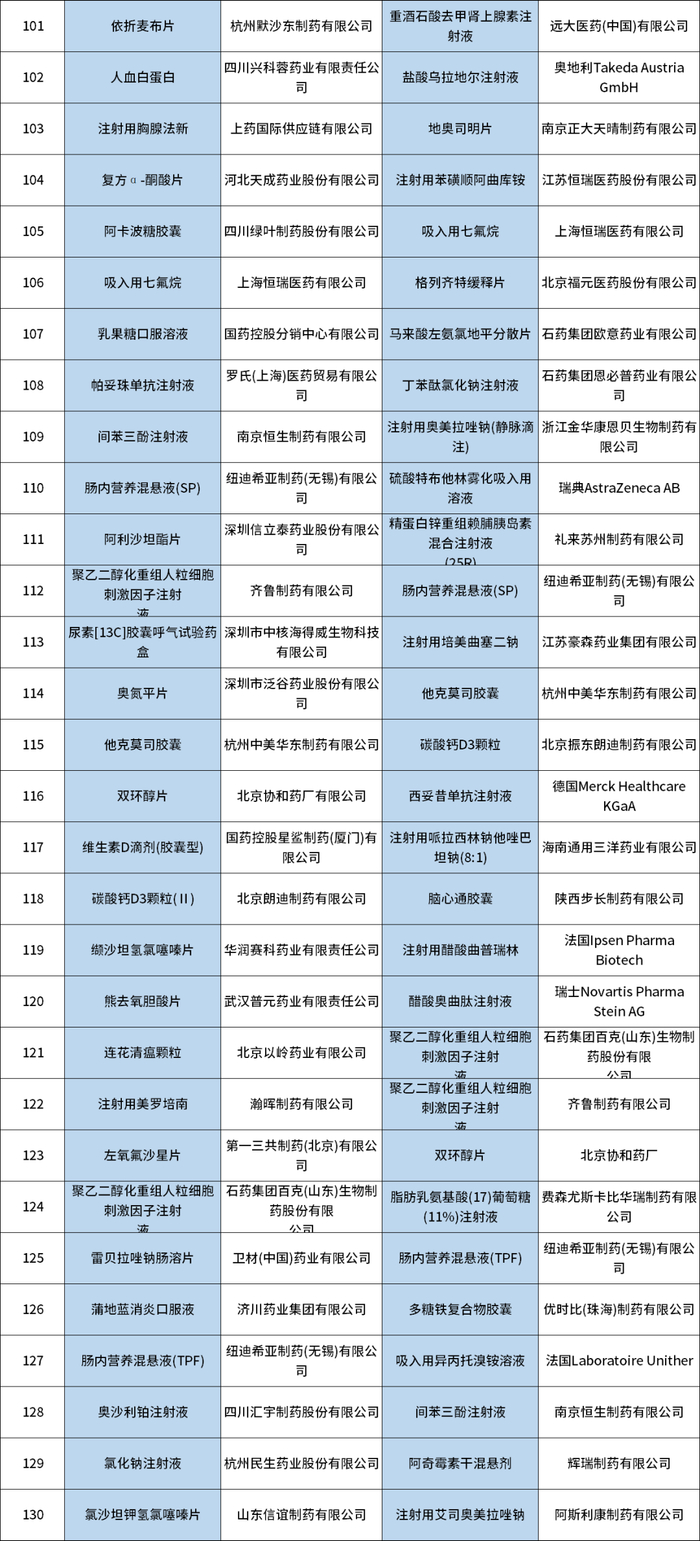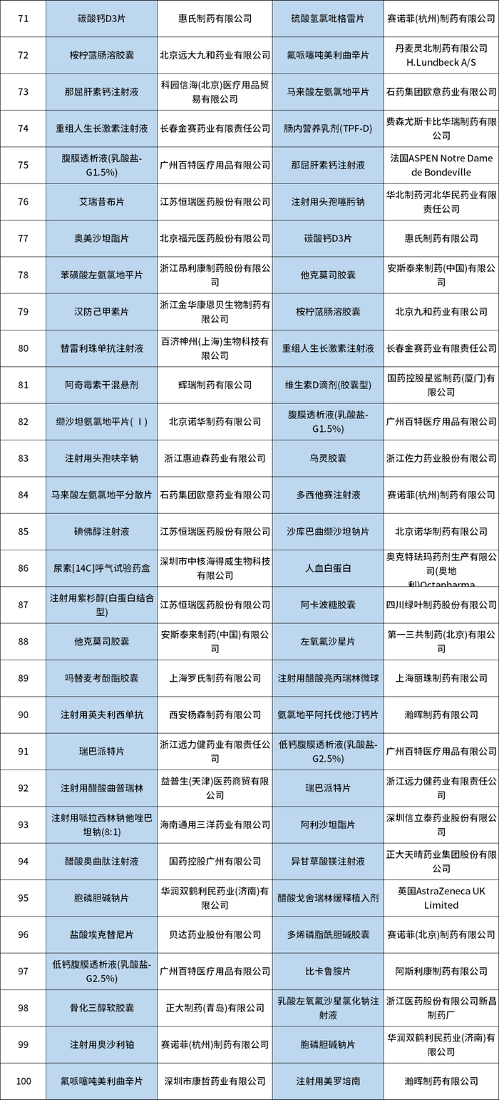 销售排名前10的药品也发生了较大变化:阿斯利康的布地奈德混悬液、拜耳的利伐沙班片、赛诺菲的甘精胰岛素、罗氏的注射用头孢曲松钠等4款药品挤出销售排名前10,其排名分别降至:23、42、16、41。