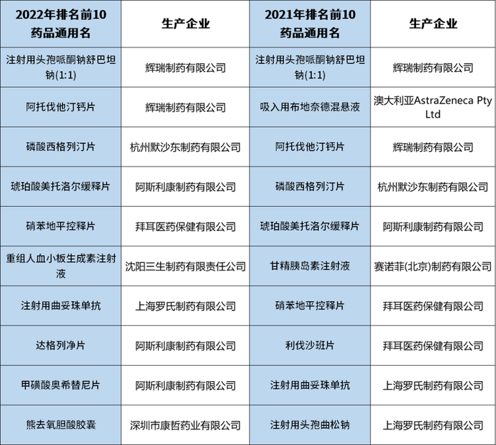 沈阳三生的重组人血小板生成素注射液、深圳康哲药业的熊去氧胆酸胶囊成功跻身销售排名前10,成为两家跻身销售前10的国产厂家。在2021年的销售排名中,并无国产厂家。