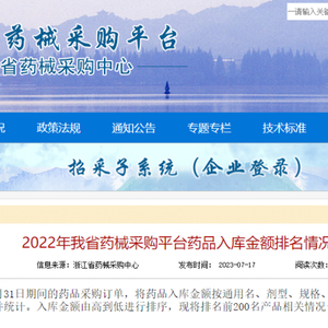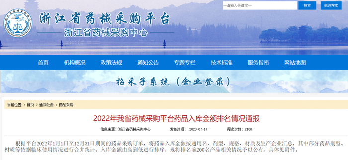 7月17日,浙江省药械采购中心发布通报,公布了该省2022年销售金额排名前200的药品。