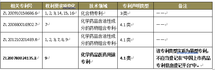 值得注意的是,对ZL200780024135.X,四川国为对其登记的权利要求9作出了4.1类声明,应当被宣告无效。并指出,该专利类型实质为晶型专利,不应当登记在“中国上市药品专利信息登记平台”中。