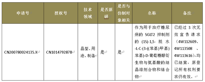 达格列净在中国专利登记平台上登记了四项专利,其登记的技术领域分别化合物、组合专利及用途专利。
