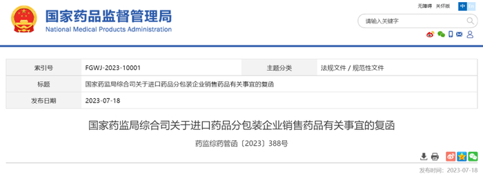 7月18日,国家药监局综合司针对上海药监局提交的《关于进口药品分包装企业销售药品有关事宜的请示》(沪药监药管〔2022〕329号)给予复函,明确: