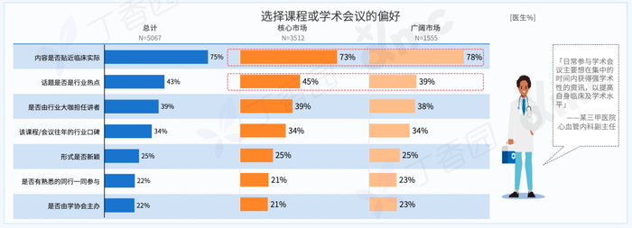 医生通过线上课程/会议汲取学术知识已形成习惯,75% 的医生表示「内容贴近临床实际」是会议选择第一要素,话题是否为行业热点及是否由行业大咖主讲次之。
