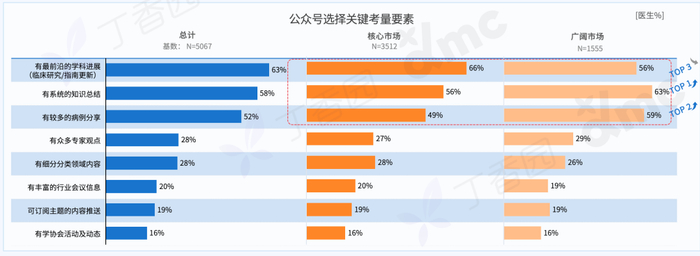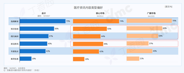 指南解读和知识总结仍是医生最关注的两类资讯。核心市场医生更偏好前沿资讯分享,广阔市场医生更关注知识总结和同行病例类内容。