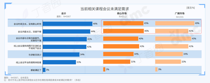 会议过长、内容深度不足、脱离临床实际及缺乏互动机会是当前医生参与线上会议的主要未满足需求,期待未来可提供兼具广度与深度,且能够围绕诊疗路径设计体系化专科化的内容。