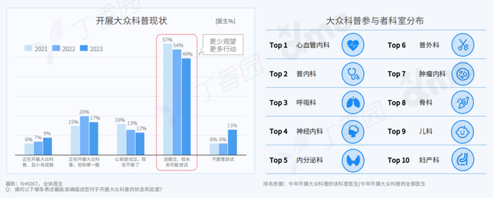 近 4 成医生开展过大众科普,慢病相关科室的医生参与度明显更高,超 7 成医生表示有参与的意愿,但缺乏时间、创作难度高是阻碍因素。医生借力专业和流量丰富的医学平台开展进一步合作的意愿强烈。